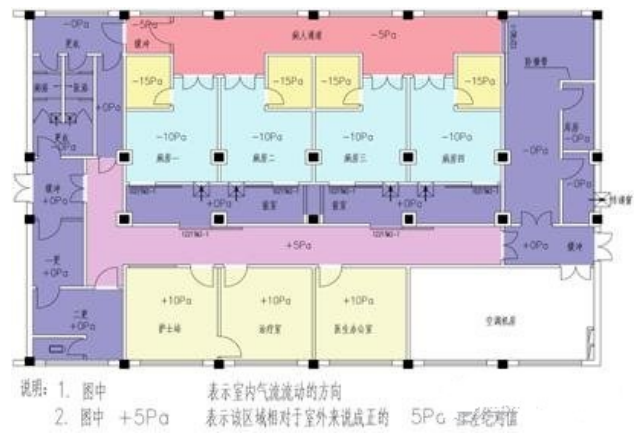 • 隔离病区内应保持一定的负压梯度,走廊→前室→隔离病房的压力依次降低。