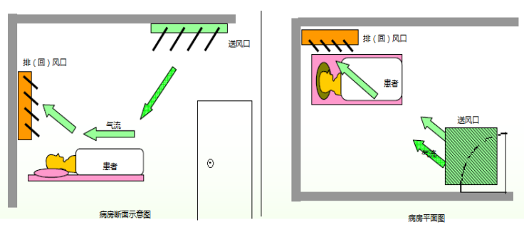 气流组织应尽量排除死区、停滞区和避免送、排风短路。送、排风口的布置一般设在病床的端头墙面,应使洁净空气首先流过病房内医护人员可能停留的区域,然后流过传染源(主要指病人头部)进入排风口。这样,医护人员就会处在气流的上风口,不会处于传染源和排风口之间。送风口布置在房间的一侧,与病人相对,排风从病人头部下风侧排出。气流组织通常受到空气送风温差、送排风口准确位置、医疗器具和家具摆放位置以及卫生保健人员和病人活动情况的影响。排风口的底部应在房间地板上方不低于100mm高的位置。